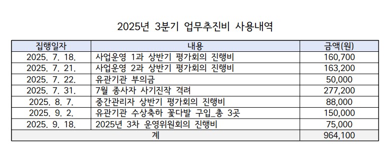 2025년 3분기 업무추진비 내역 공개 페이지 정보 작성자 : 마포자활 작성일 : 25-09-30 본문 서울마포지역자활센터는 회계 투명성 확보 및 사회복지시설 업무추진비 공개와 관련하여 2025년 3분기 업무추진비 내역을 공개합니다. 목록 이전글[채용공고] 자활근로사업 담당(사회복지사) 채용 모집 공고 25.10.13 다음글2025년 3차 추경예산서 공고 25.09.30