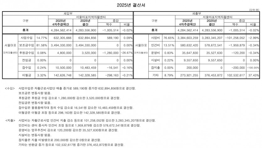 공지사항 2025년 결산서 공고 페이지 정보 작성자 : 마포자활 작성일 : 26-02-27 본문 사회복지법인 및 사회복지시설 재무·회계 규칙 제10조에 의거하여붙임과 같이 2025년 서울마포지역자활센터 결산을 홈페이지에 공고합니다. 1. 공고기간: 2026. 2. 27. ~ 2026. 3. 19. (20일 이상)2. 공고장소: 게시판 및 홈페이지3. 문의 : 02-312-7942(서울마포지역자활센터 운영실장) 목록 이전글2026년 1차 추경예산서 공고 26.02.27 다음글2025년 후원금(품) 공개 26.02.27