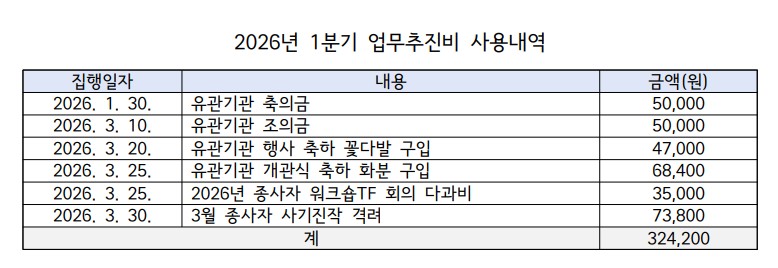 2026년 1분기 업무추진비 내역 공개 페이지 정보 작성자 : 마포자활 작성일 : 26-03-31 본문 서울마포지역자활센터는 회계 투명성 확보 및 사회복지시설 업무추진비 공개와 관련하여 2026년 1분기 업무추진비 내역을 공개합니다. 목록 다음글2026년 1차 추경예산서 공고 26.02.27