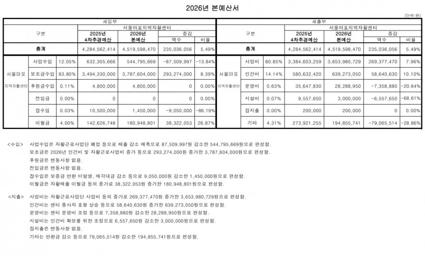 2026년 본예산서 공고 페이지 정보 작성자 : 마포자활 작성일 : 25-12-19 본문 사회복지법인 및 사회복지시설 재무·회계 규칙 제10조에 의거하여붙임과 같이 2026년 서울마포지역자활센터 본예산을 홈페이지에 공고합니다. 1. 공고기간: 2025. 12. 18. ~ 2026. 1. 17 (20일 이상)2. 공고장소: 게시판 및 홈페이지3. 문의 : 02-312-7942(서울마포지역자활센터 운영실장) 목록 다음글2025년 4차 추경예산서 공고 25.12.19