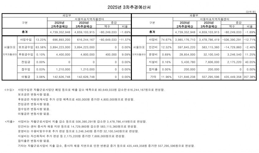2025년 3차 추경예산서 공고 페이지 정보 작성자 : 마포자활 작성일 : 25-09-30 본문 사회복지법인 및 사회복지시설 재무·회계 규칙 제10조에 의거하여붙임과 같이 2025년 서울마포지역자활센터 3차 추가경정예산을 홈페이지에 공고합니다. 1. 공고기간: 2025. 9. 30. ~ 2025. 10. 19. (20일 이상)2. 공고장소: 게시판 및 홈페이지3. 문의 : 02-312-7942(서울마포지역자활센터 운영실장) 목록 이전글2025년 3분기 업무추진비 내역 공개 25.09.30 다음글2025년 서울마포지역자활센터 자활근로사업단 불용품(주방비품) 매각 입찰 공고(2차) 25.09.09